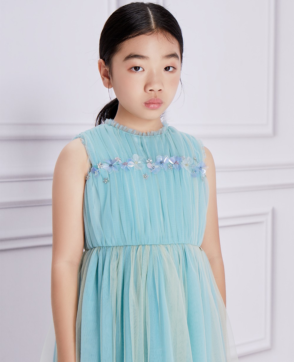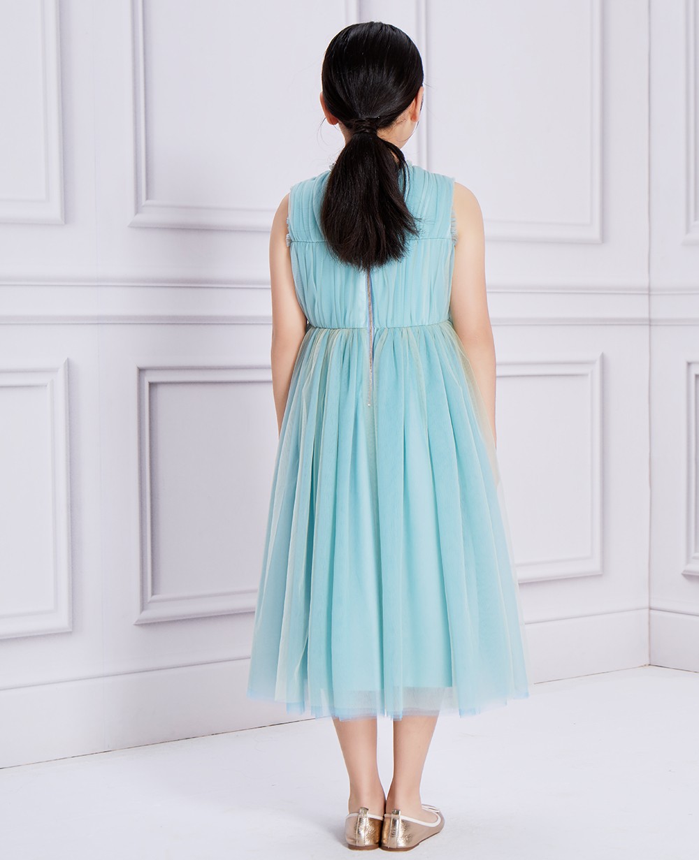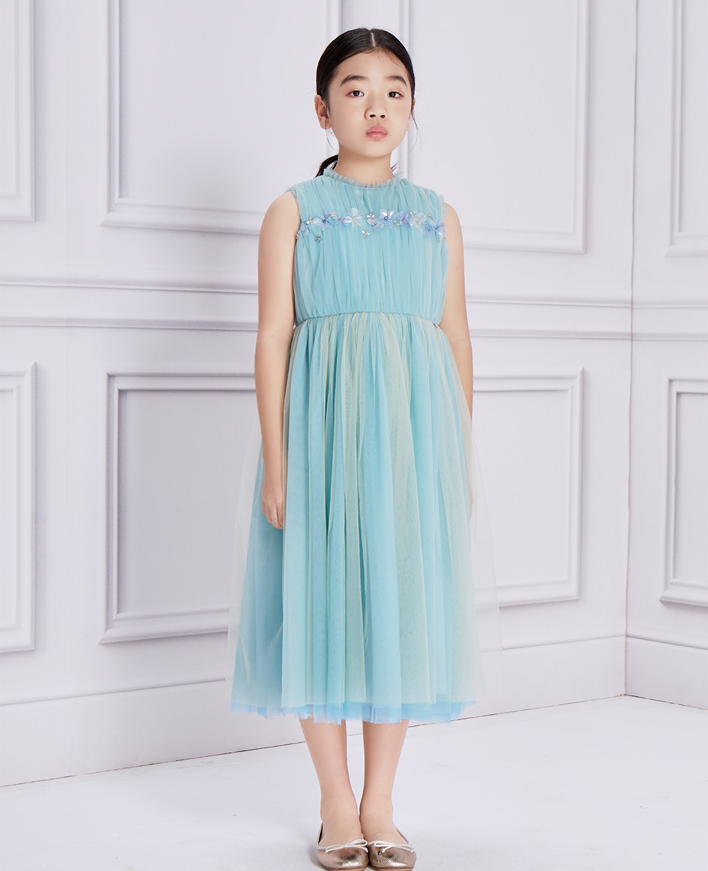 | 描述 | 这是一件优雅时尚,可用于正式场合的公主裙。主要由蓝色和黄色网纱做成,在胸前的接缝处有蓝色系的珠片定珠装饰,上半身是一个无袖设计,下半身是蓝色和绿色丰富的薄纱层配上缎面的内衬里面是柔软的棉纱,裙长到小腿处,背部有一个拉链。这款水蓝色无袖连衣裙对各种身材具有强烈的包容性,版型提升腰线使人显得修长,展示儿童身资可爱的一面。 |