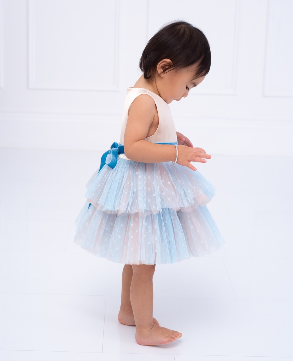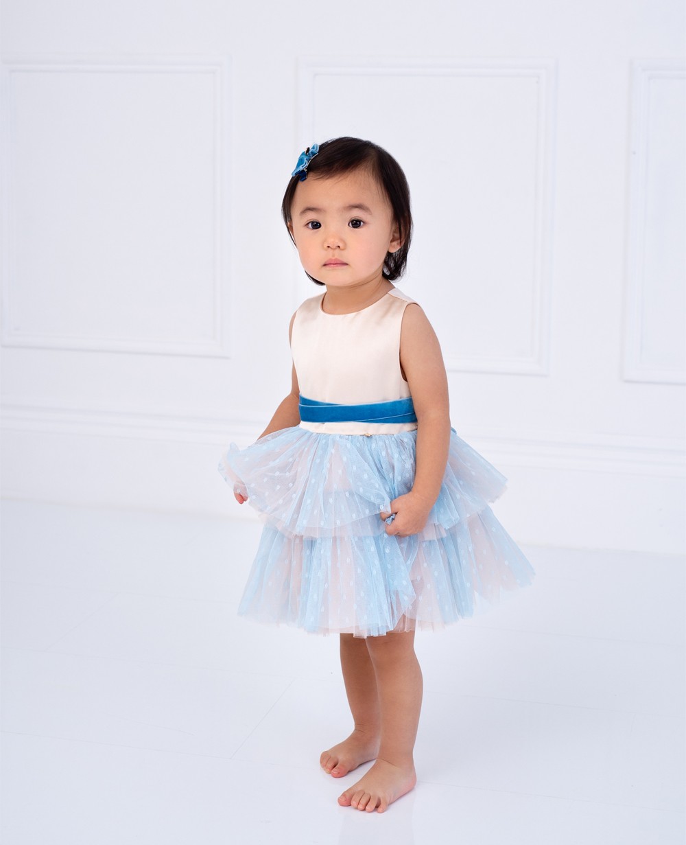 | 描述 | 这是一件优雅时尚,可用于正式场合的公主裙。主要裸色缎面和蓝色波点网纱做成,腰间是深蓝色金丝绒绑带设计,上半身是一个无袖设计,下半浅蓝色波点网纱配上裸色网布加上缎面的内衬里面是柔软的棉纱,裙长到膝盖处,背部有一个拉链。这款裸色断面蓝色波点网纱短裙对各种身材具有强烈的包容性,版型提升腰线使人显得修长,展示儿童身资可爱的一面。 |