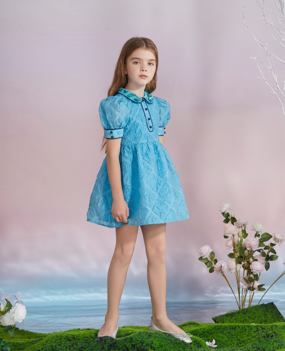 | 描述 | 这是一件优雅时尚,可用于正式场合的公主裙。主要湖蓝色亮面提花布做成,这条裙子领子有精致的珠片钉珠细节,袖子是精致的泡泡袖和深蓝色边装饰裙长到膝盖处,背部有一个拉链。这款湖蓝色蓝色光泽感提花泡泡袖短裙对各种身材具有强烈的包容性,版型提升腰线使人显得修长,展示儿童身资可爱的一面。 |
