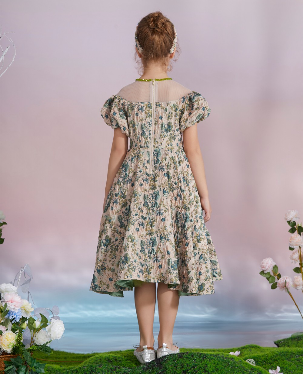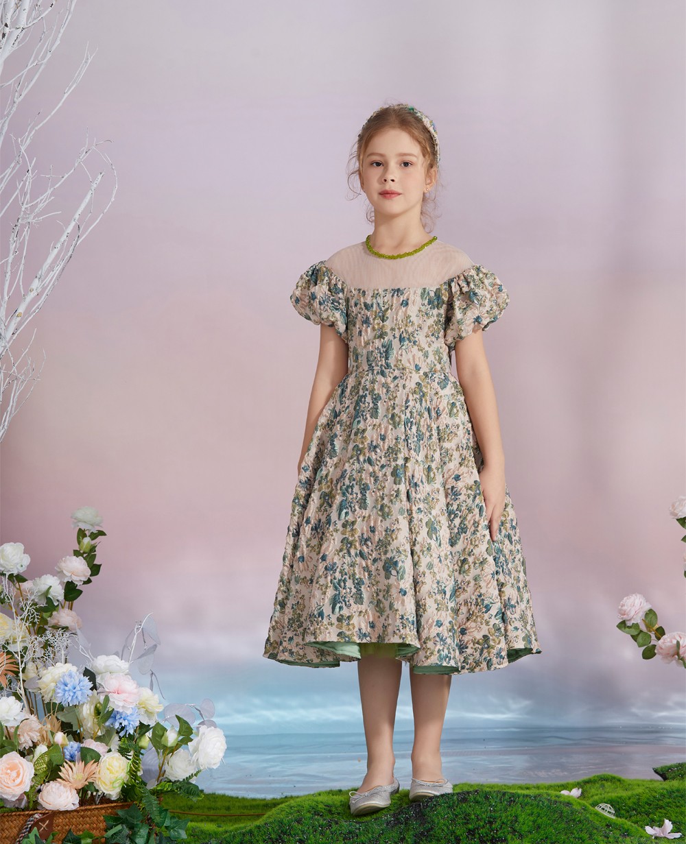 | 描述 | 这是一件优雅时尚,可用于正式场合的公主裙。主要由绿色提花做成,这条裙腰部打褶肩部是落肩设计,在缎面下裙子有着丰富的薄纱层配上缎面的内衬里面是柔软的棉纱,裙长到小腿处,背部有一个拉链。这款绿色花朵长裙对各种身材具有强烈的包容性,版型提升腰线使人显得修长,展示儿童身资可爱的一面。 |
