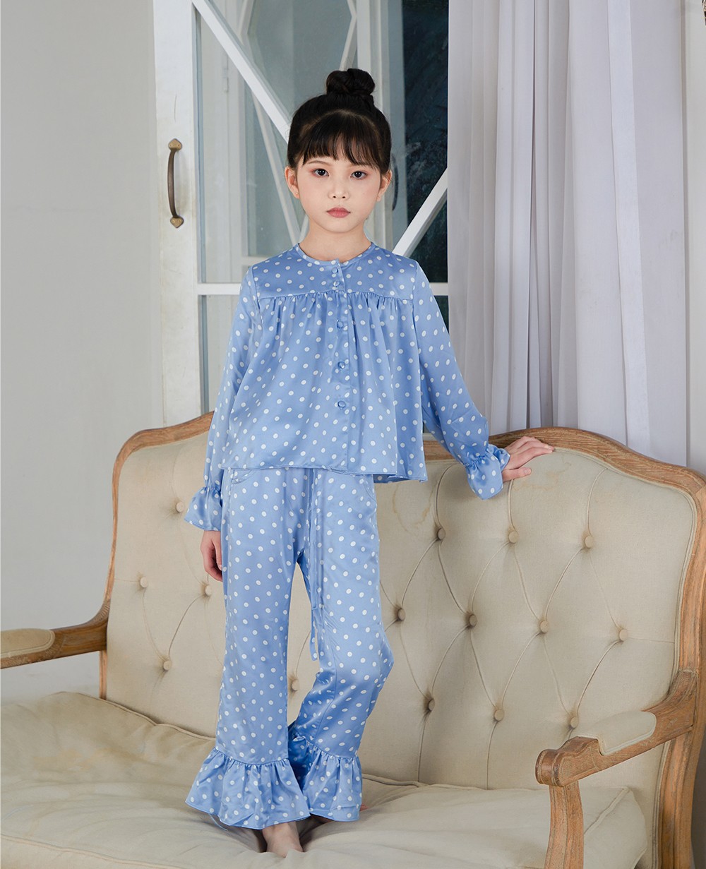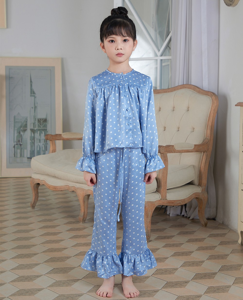这是一套舒适绒软的睡衣套装。主要天蓝色白色波点缎面做成,胸前有本布包扣袖子和裤脚有花边装饰,这款睡衣长袖套装对各种身材具有强烈的包容性,版型提升腰线使人显得修长,展示儿童身资可爱的一面。