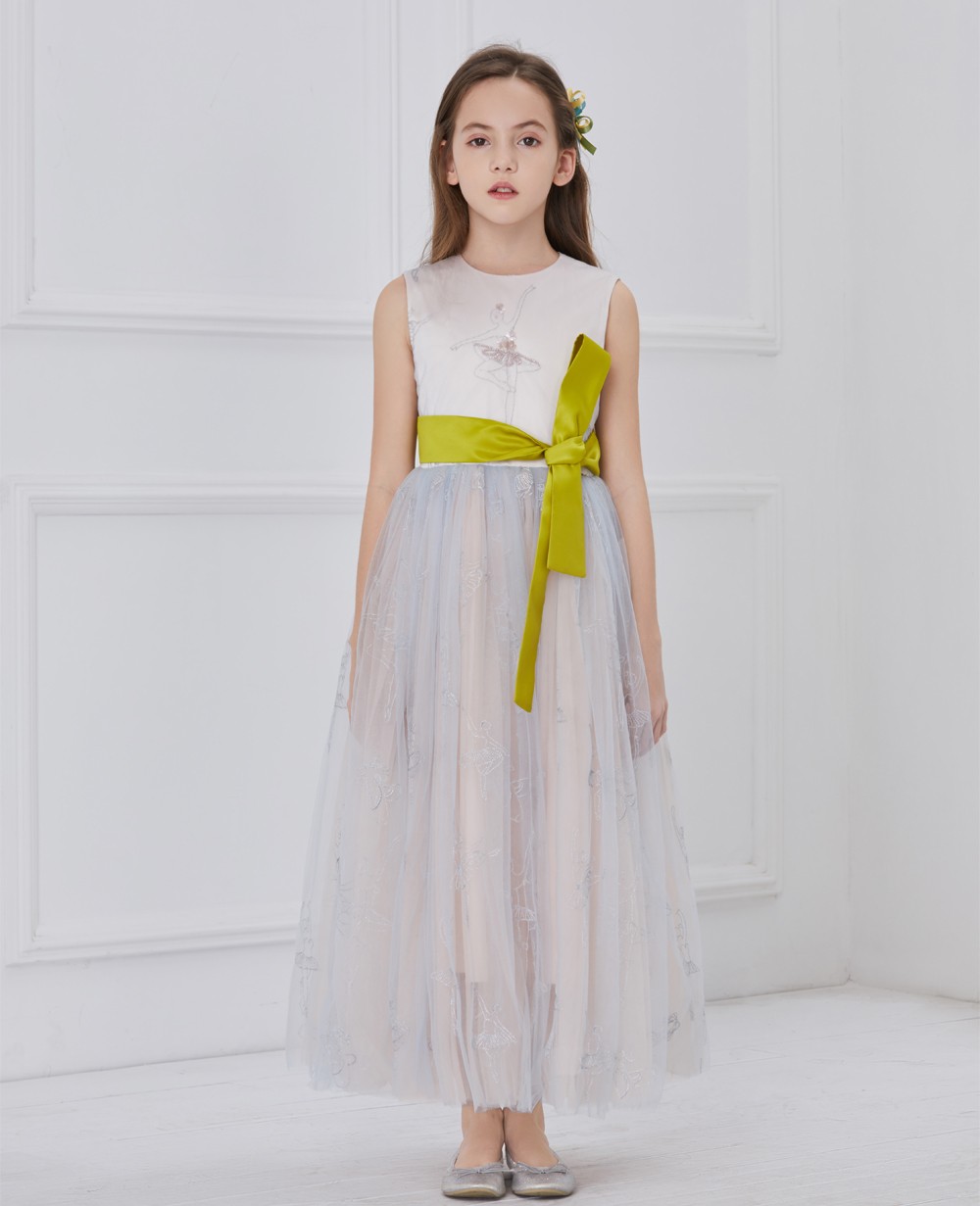 | 描述 | 这是一件优雅时尚,可用于正式场合的公主裙。主要裸色缎面和淡蓝色芭蕾舞者刺绣网纱做成,胸前分布着精致的蕾丝刺绣细节,上半身是一个无袖背心设计,下半裸色硬网与裸色丰富的薄纱层交叉重叠配上缎面的内衬里面是柔软的棉纱,裙长到脚踝处,背部有一个拉链。这款无袖裸色刺绣蕾丝网纱长裙对各种身材具有强烈的包容性,版型提升腰线使人显得修长,展示儿童身资可爱的一面。 |