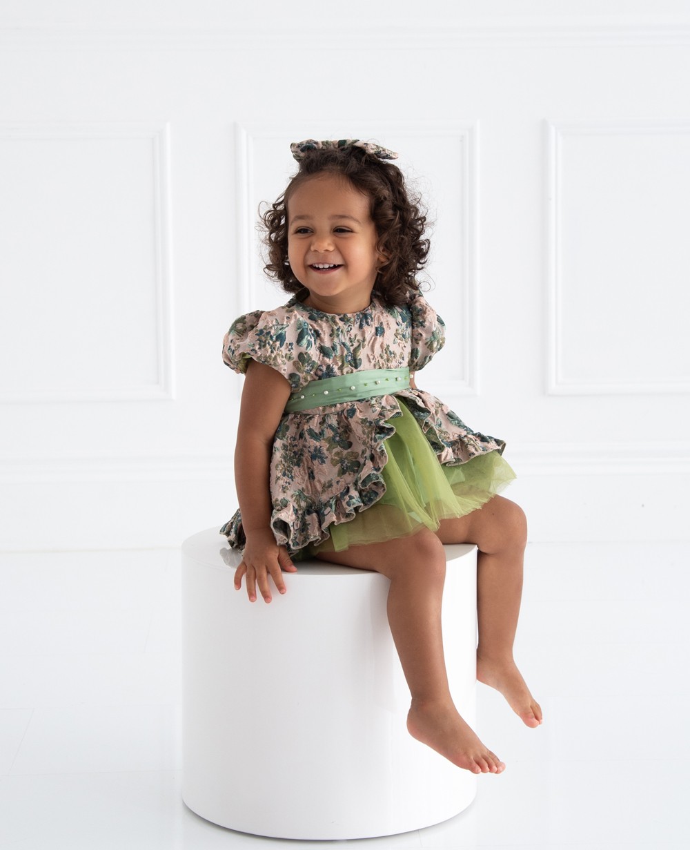| 描述 | 这是一件优雅时尚,可用于正式场合的公主裙。主要由墨绿色提花和绿色网纱做成,腰间有绿色缎面细节装饰,上半身是一个泡泡袖设计,下半身是绿色提花和网纱层配上缎面的内衬里面是柔软的棉纱,裙长前面到膝盖上,背部有一个拉链。这款绿色泡泡袖提花连衣裙对各种身材具有强烈的包容性,版型提升腰线使人显得修长,展示儿童身资可爱的一面。 |
