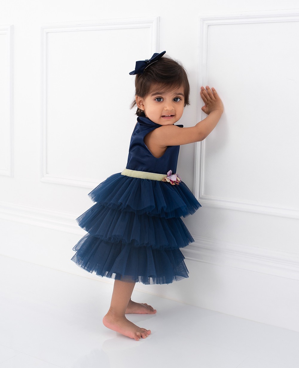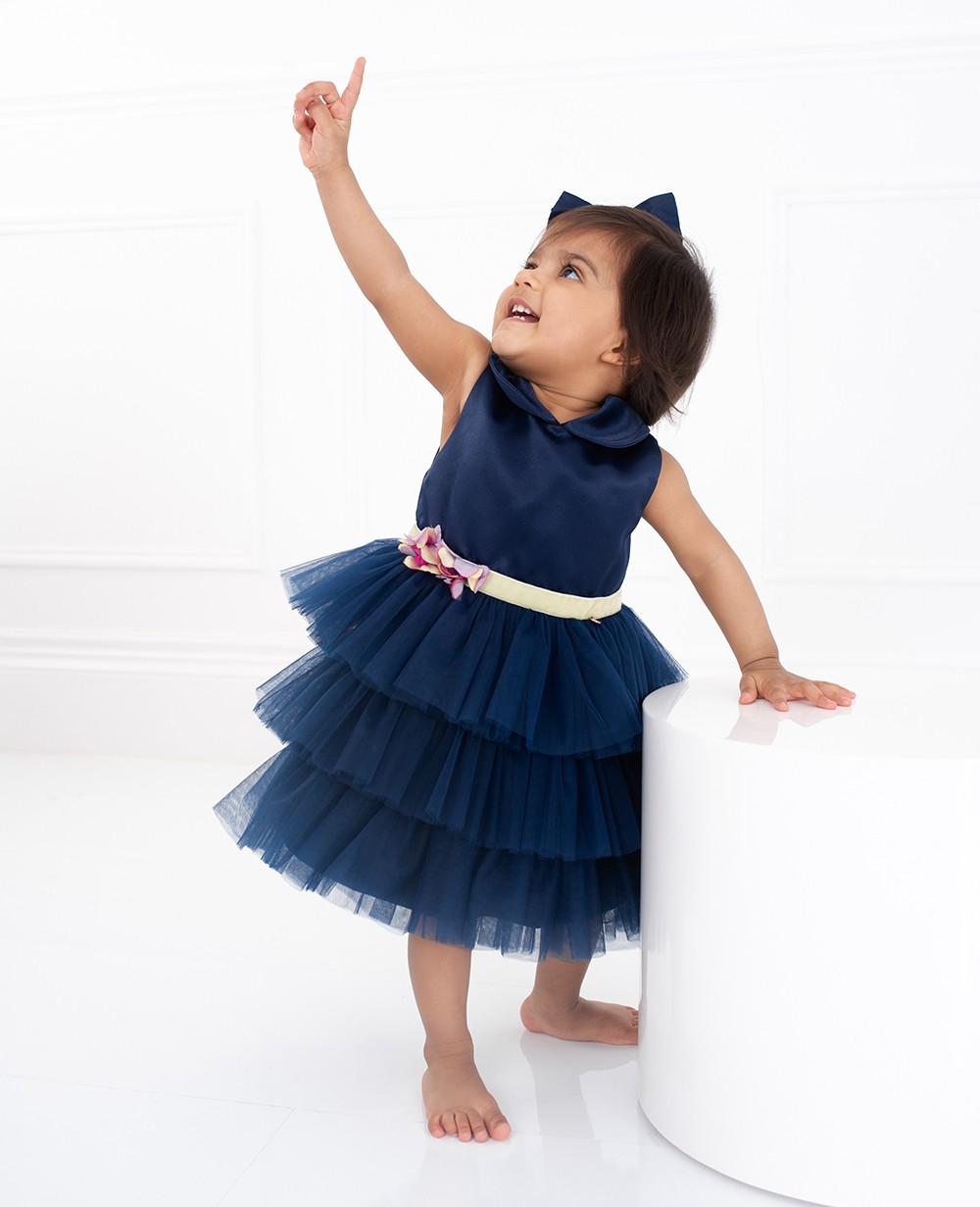 | 描述 | 这是一件优雅时尚,可用于正式场合的公主裙。深蓝色缎面配上撞色腰带和手工定制布花装饰,搭配圆形小领子的造型更显可爱,下半身是丰富的深蓝色网纱层配上柔软的缎面和棉布内衬,裙长到膝盖,背部有一个拉链。这款深蓝色金色腰带连衣短裙对各种身材具有强烈的包容性,版型提升腰线使人显得修长,展示儿童身资可爱的一面。 |