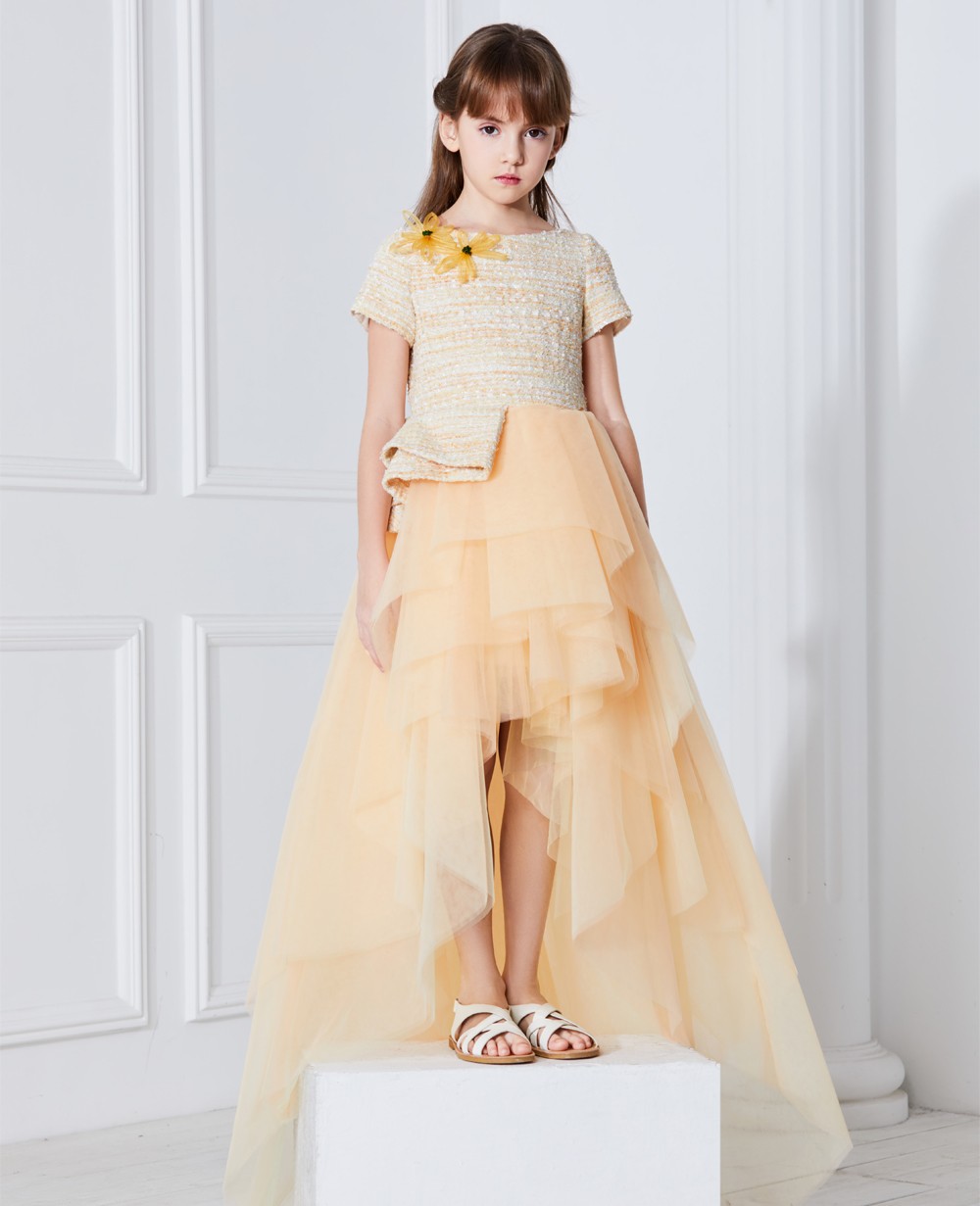这是一件优雅时尚,可用于正式场合的公主裙。主要由淡黄色编制面料和淡黄色网纱做成,肩上有手工制作花朵形状装饰,上半身是一个小盖袖,腰部有不规则剪裁,下半身是由三种不同颜色的薄纱层相互重叠配上缎面的内衬里面是柔软的棉纱,裙长到脚踝处,背部有一个拉链。这款淡黄色短袖连衣裙对各种身材具有强烈的包容性,版型提升腰线使人显得修长,展示儿童身资可爱的一面。预售款式的礼服需要4-6周的时间发货。