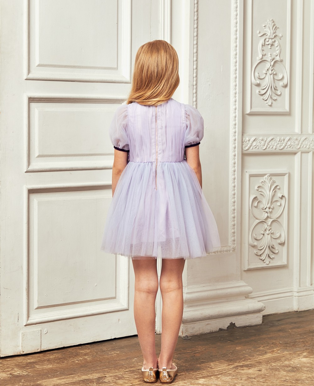 | 描述 | 这是一件优雅时尚,可用于正式场合的公主裙。主要由三种颜色网纱做成,袖子是由网纱做成的精致的抛抛短袖,肩部和腰间分布着精致的钉珠细节,下半紫色蓝色和灰色丰富的薄纱层交叉重叠配上缎面的内衬里面是柔软的棉纱,裙长到膝盖上,背部有一个拉链。这款抛抛袖淡紫色钉珠网纱短裙对各种身材具有强烈的包容性,版型提升腰线使人显得修长,展示儿童身资可爱的一面。 |