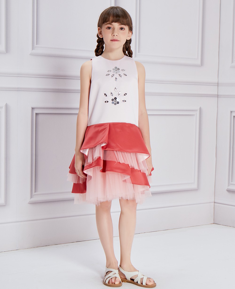 | 描述 | 这是一件优雅时尚,可用于正式场合的公主裙。主要由粉色和桃红色缎面做成,胸部有精致的钉珠细节装饰,上半身是一个无袖带一点落腰设计,下半由不规则剪裁缎面与浅粉色丰富的薄纱层交叉重叠配上缎面的内衬里面是柔软的棉纱,裙长到膝盖上,背部有一个拉链。这款粉色红色网纱连衣裙对各种身材具有强烈的包容性,版型提升腰线使人显得修长,展示儿童身资可爱的一面。 |