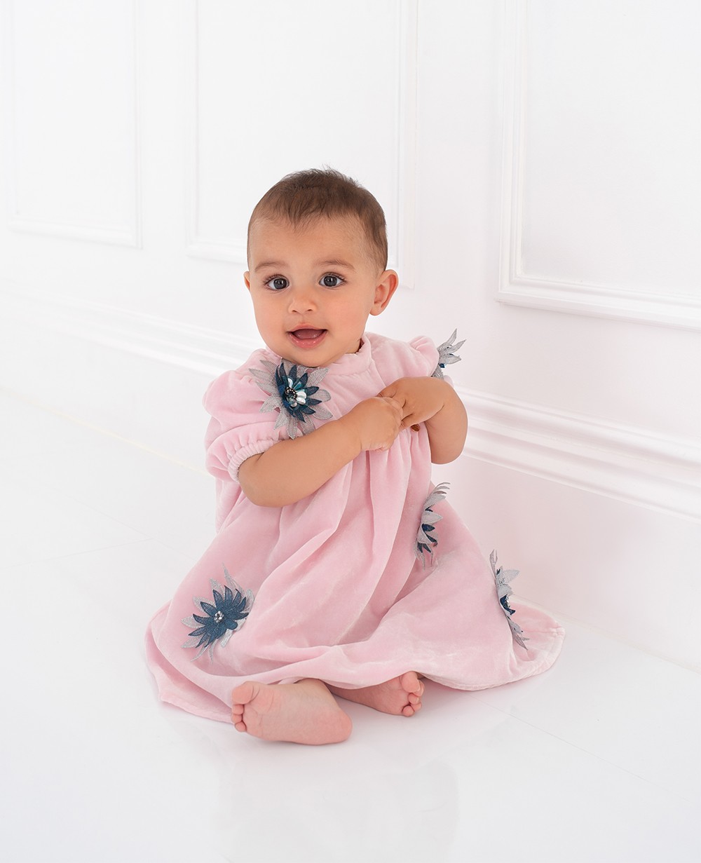| 描述 | 这是一件优雅时尚,可用于正式场合的公主裙。粉色金丝绒上有一朵朵蓝色蕾丝小花和精致的钉珠细节装饰,搭配泡泡袖的造型更显可爱,下半身是粉色金丝绒配上柔软的棉布内衬,裙长到膝盖,背部有一个拉链。这款粉色金丝绒连衣短裙对各种身材具有强烈的包容性,版型提升腰线使人显得修长,展示儿童身资可爱的一面。 |