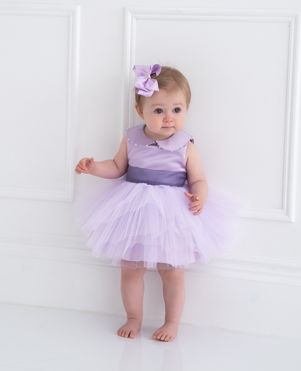 | 描述 | 这是一件优雅时尚,可用于正式场合的公主裙。主要由淡紫色缎面和淡紫色网纱做成,小圆领设计配上珍珠细节装饰,腰间配有欧根纱腰带,上半身是无袖设计,下半身是紫色色的网纱层配上缎面的内衬里面是柔软的棉纱,裙长前面到膝盖上,背部有一个拉链。这款淡紫色无袖连衣裙对各种身材具有强烈的包容性,版型提升腰线使人显得修长,展示儿童身资可爱的一面。 |