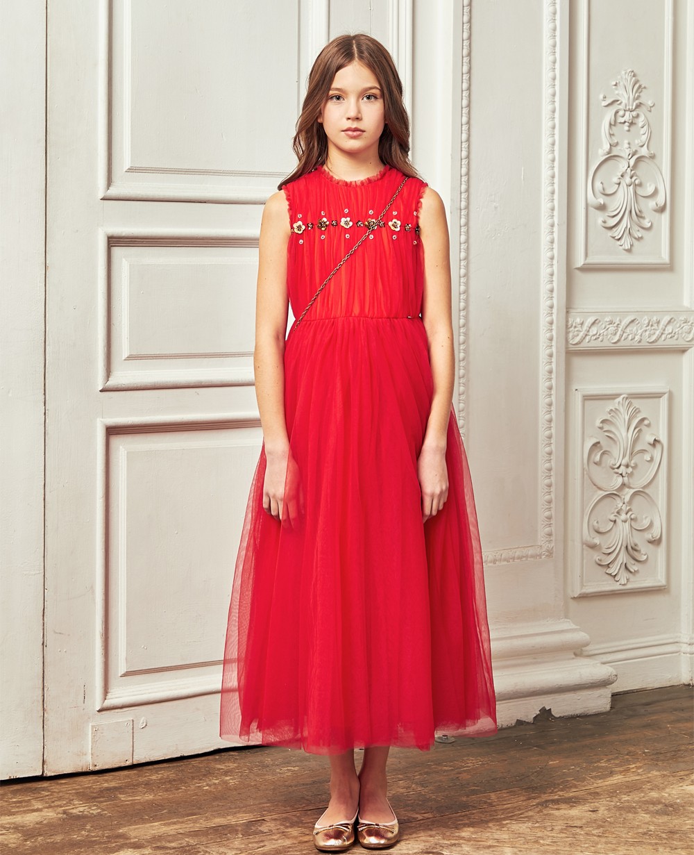 这是一件优雅时尚,可用于正式场合的公主裙。主要由大红色网纱做成,在胸前的接缝处有金色系的珠片定珠装饰,上半身是一个无袖设计,下半身是红色丰富的薄纱层配上缎面的内衬里面是柔软的棉纱,裙长到脚踝处,背部有一个拉链。这款水大红色无袖连衣裙对各种身材具有强烈的包容性,版型提升腰线使人显得修长,展示儿童身资可爱的一面。