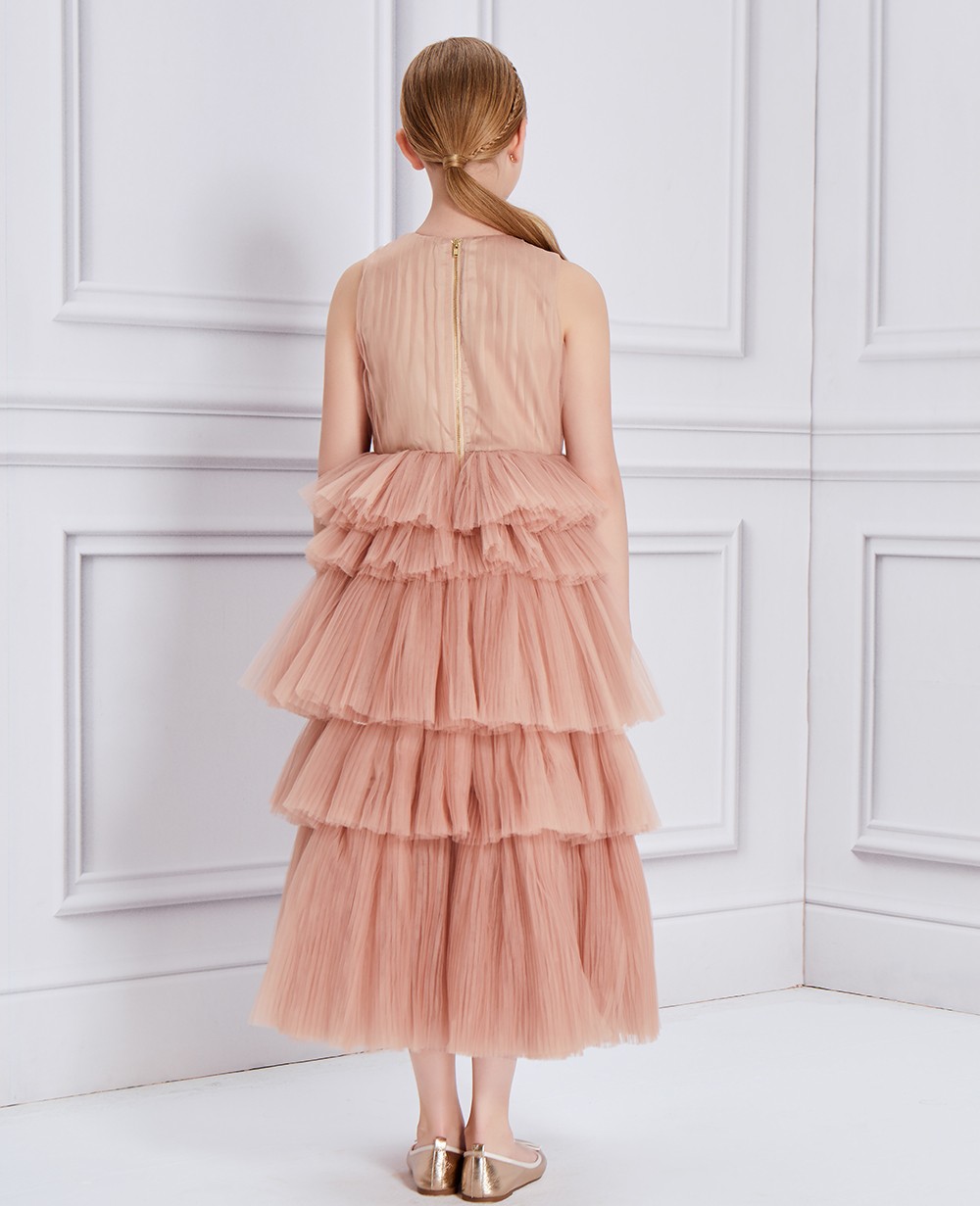 | 描述 | 这是一件优雅时尚,可用于正式场合的公主裙。主要由裸色网纱做成,肩部和腰部精致定珠细节装饰,上半身是一个无袖设计,下半身裸色丰富的压褶薄纱层配上缎面的内衬里面是柔软的棉纱,裙长到脚踝处,背部有一个拉链。这款玫瑰金网纱定珠连衣裙对各种身材具有强烈的包容性,版型提升腰线使人显得修长,展示儿童身资可爱的一面。 |