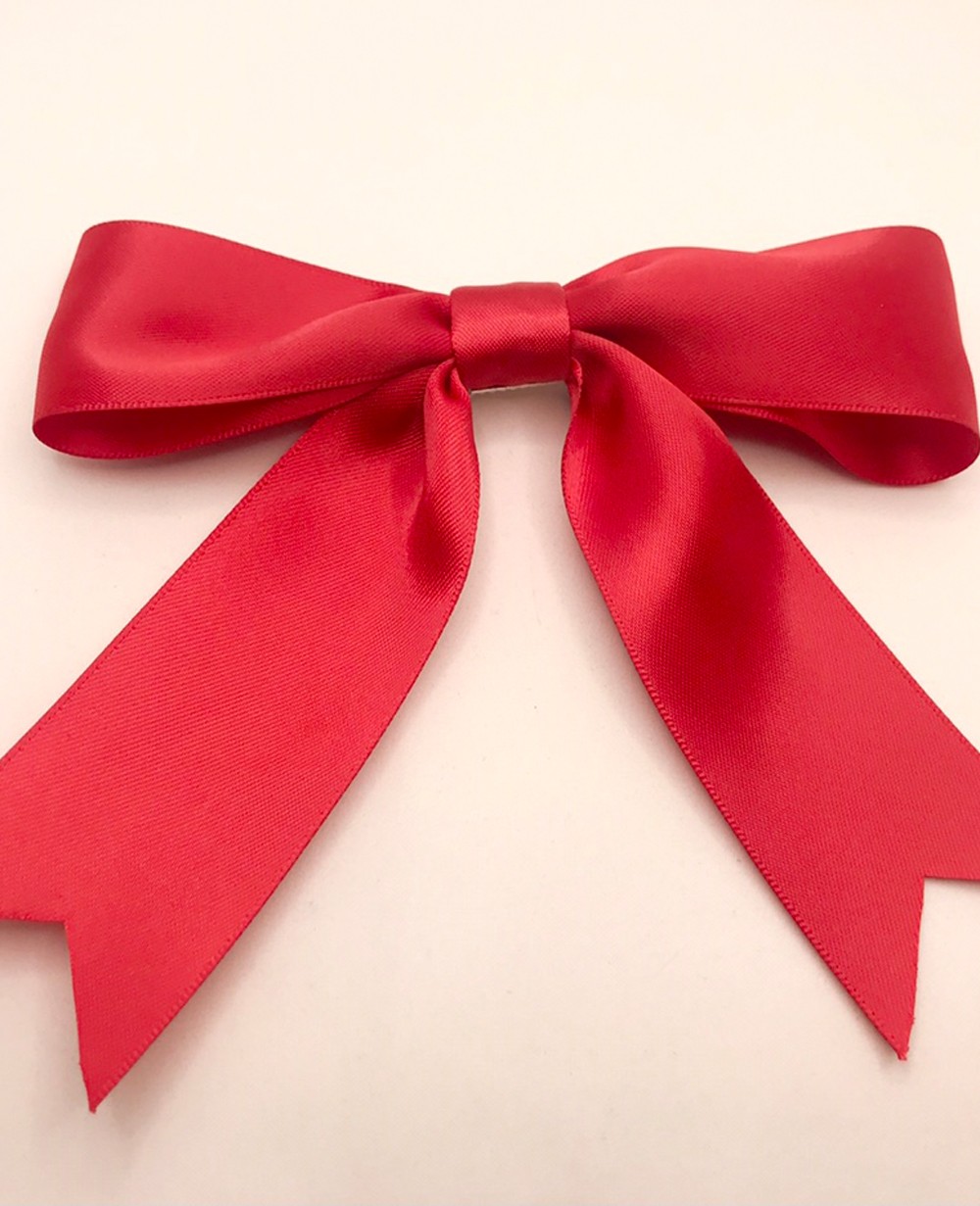 描述 这款漂亮的大红色蝴蝶结夹子主要由红色缎面织带做成,更显精致。