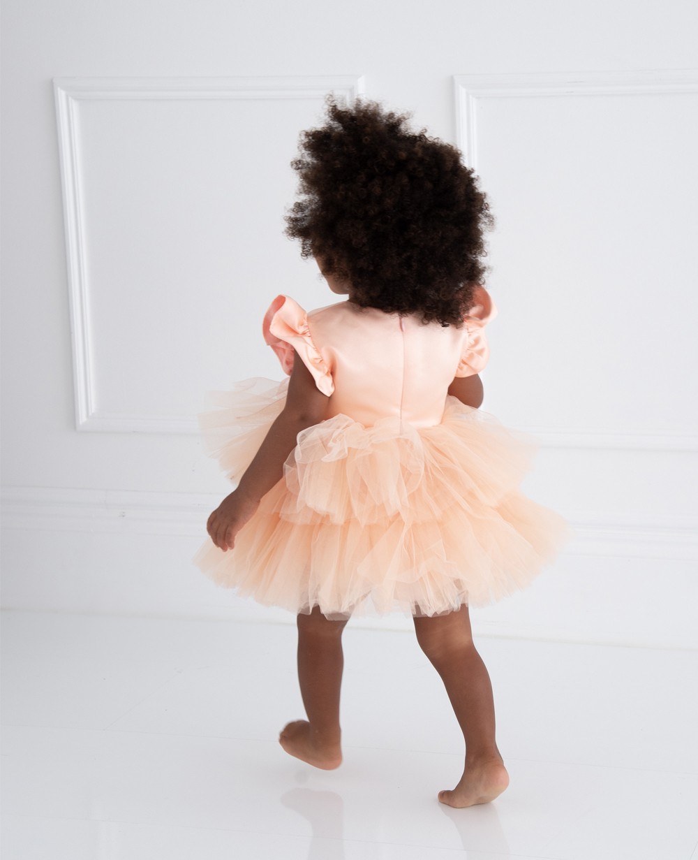 | 描述 | 这是一件优雅时尚,可用于正式场合的公主裙。主要由橘粉色缎面和橘粉色网纱做成,腰部有精致的欧根纱花朵细节装饰,上半身是一个小飞袖设计,下半身是俩层橘粉色的网纱层配上缎面的内衬里面是柔软的棉纱,裙长前面到膝盖上,背部有一个拉链。这款橘粉色小飞袖连衣裙对各种身材具有强烈的包容性,版型提升腰线使人显得修长,展示儿童身资可爱的一面 |