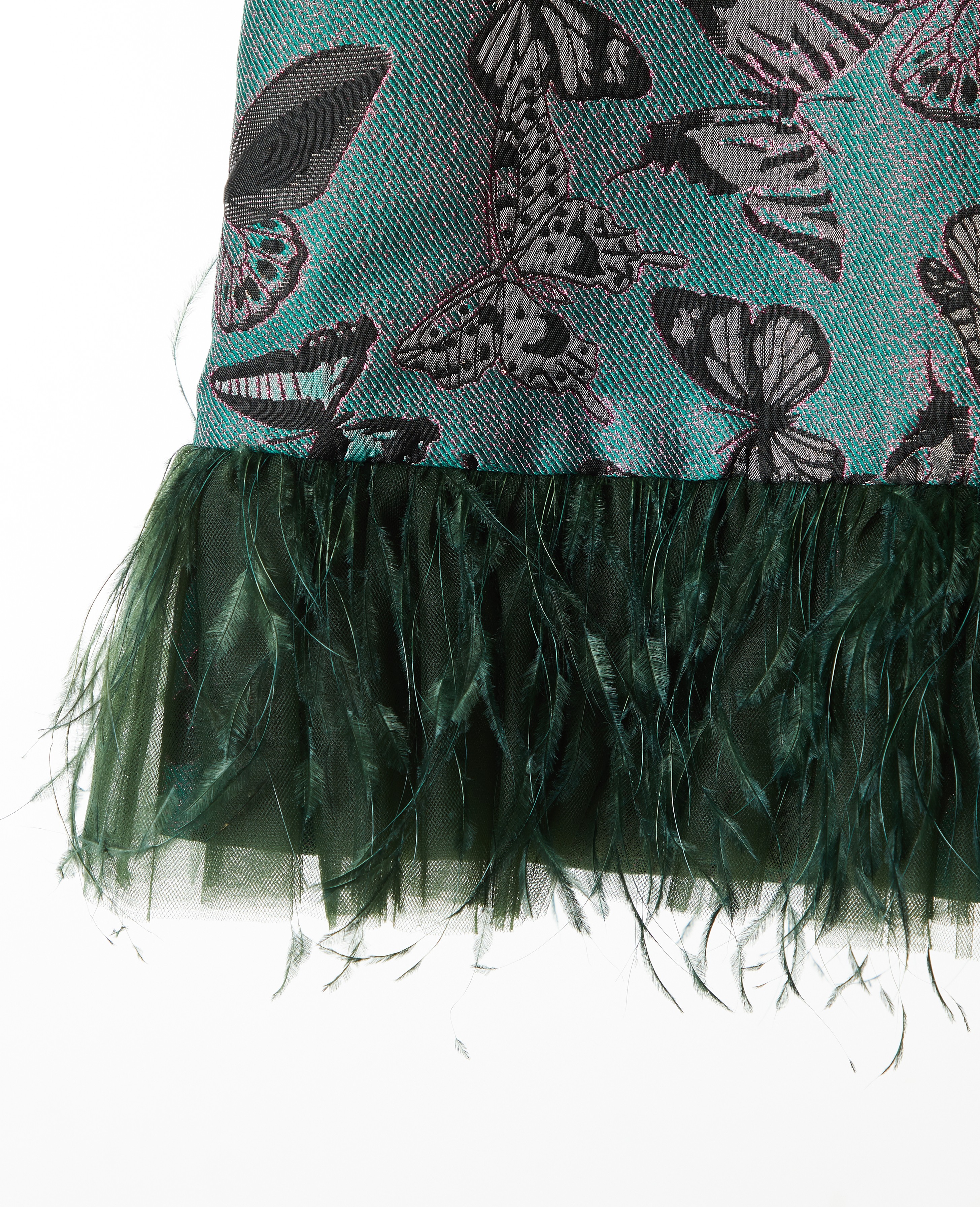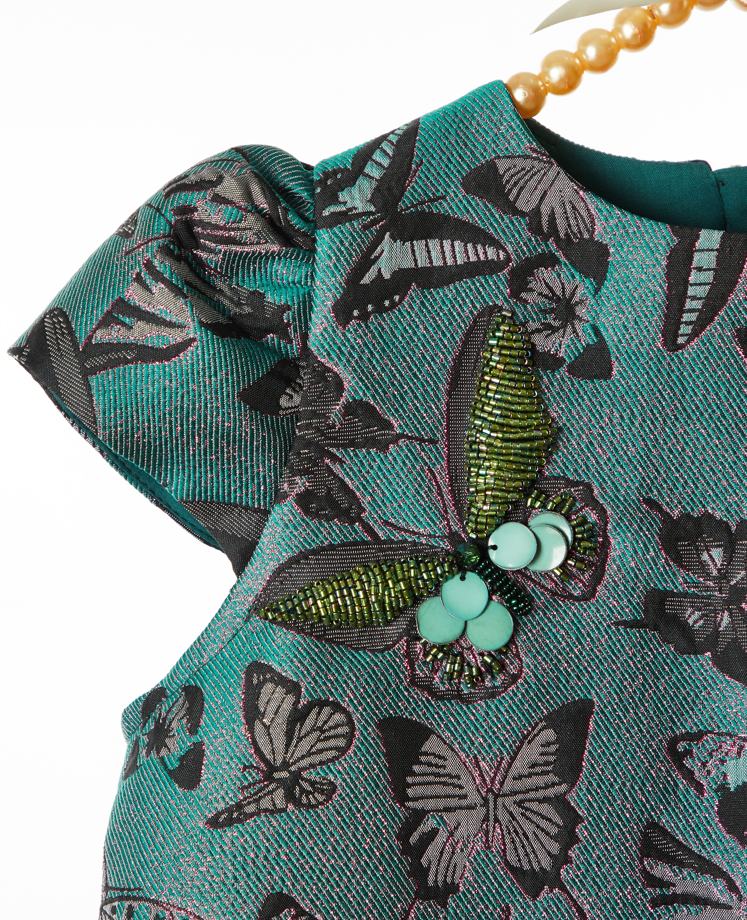 | 描述 | 这是一件优雅时尚,可用于正式场合的礼服裙,翡翠绿色的舞会裙。闪亮的绿色印花上装饰有黑色和银色的蝴蝶图案,石灰绿的珠子和小亮片。下摆则是一个墨绿色薄纱,以羽毛装饰。内衬是柔软舒适的棉布,背部有一个拉链。对各种身材具有强烈的包容性,版型提升腰线使人显得修长,展示儿童身资可爱的一面。 |