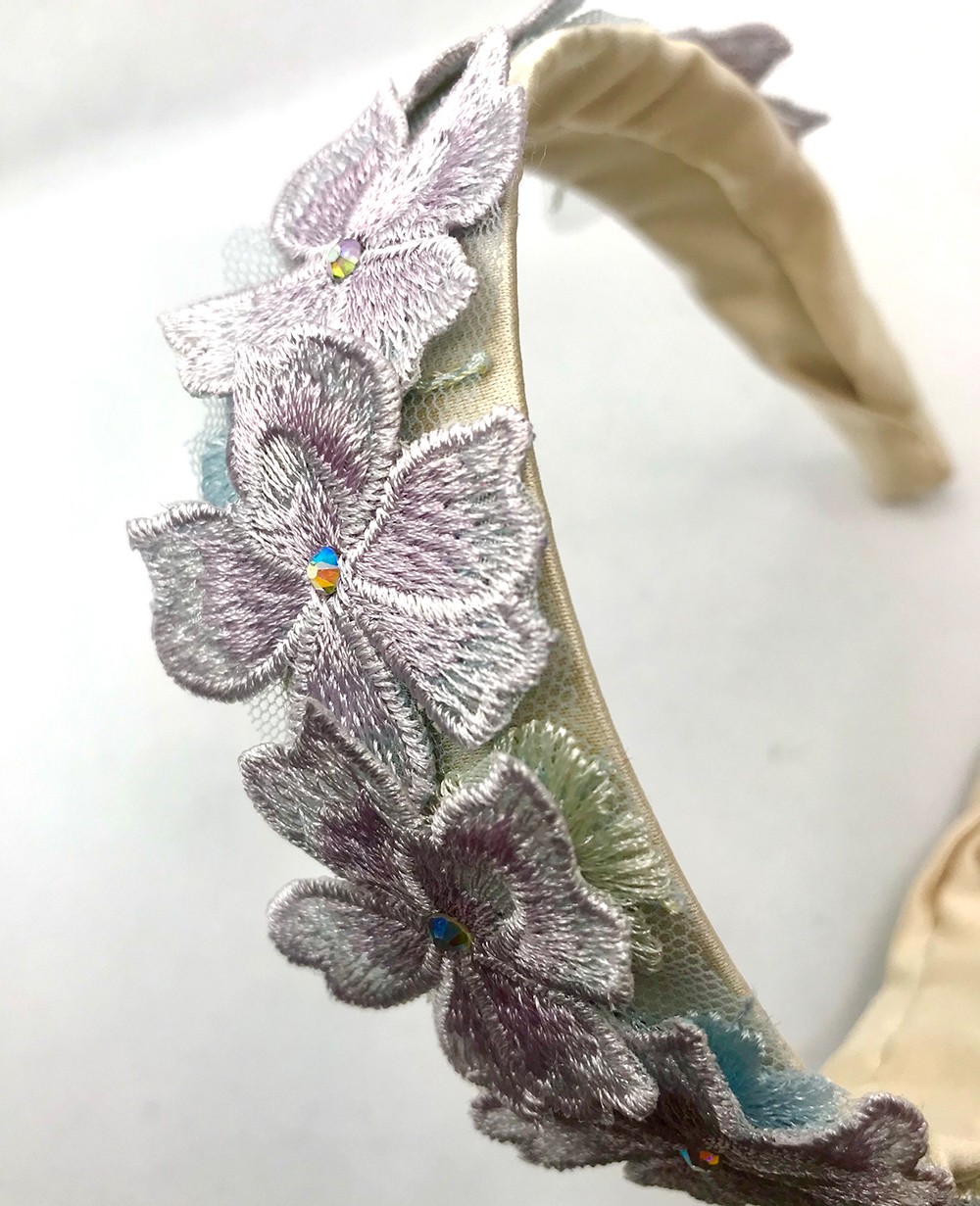 这款粉紫色宽发箍由裸色缎面包裹,上面有着粉紫色蕾丝刺绣小花细节装饰,更显特别。