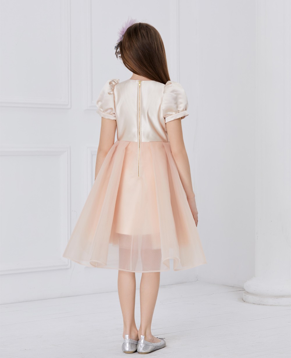 杏粉色缎面蕾丝刺绣短袖网纱连衣裙公主裙