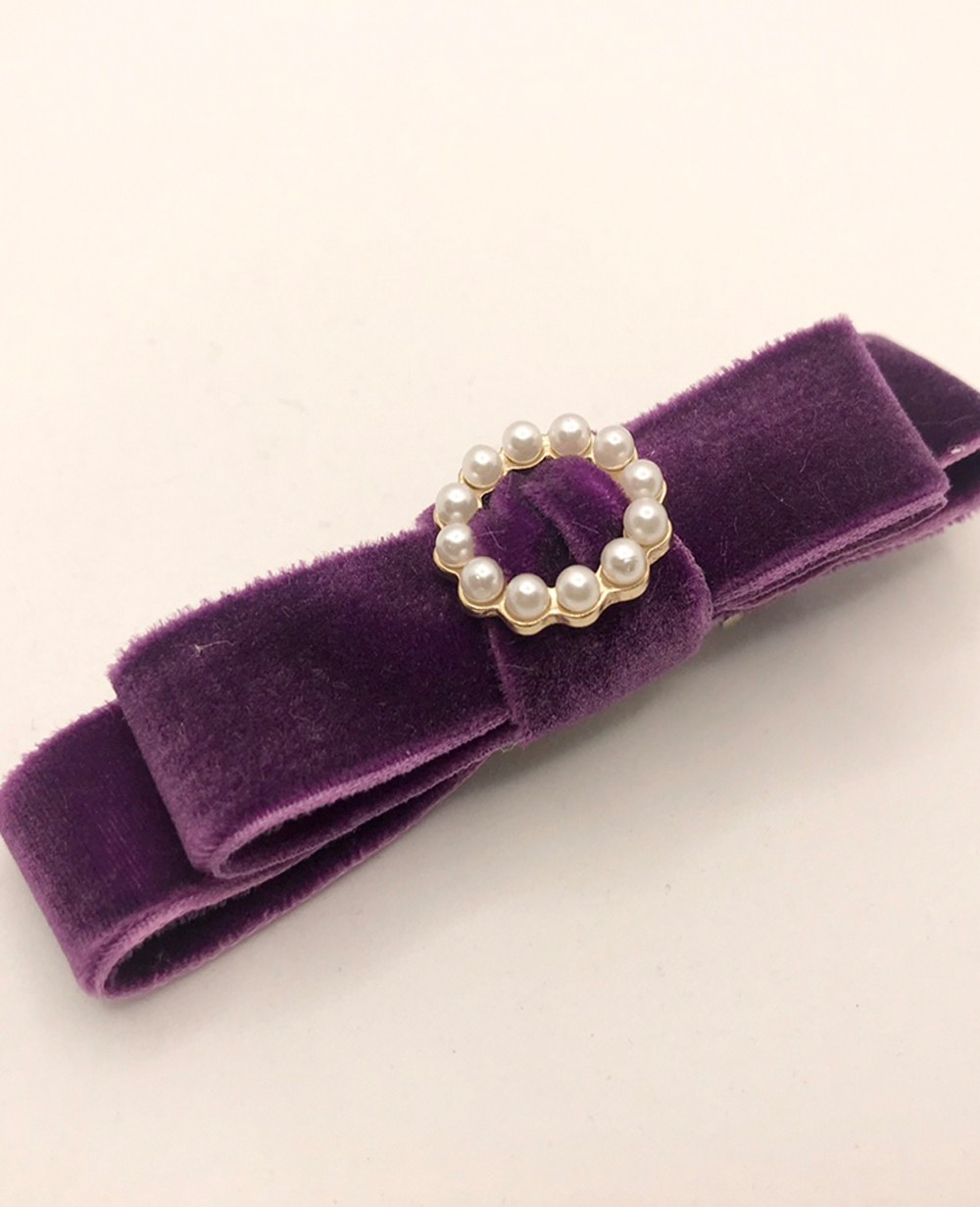 这款深紫色蝴蝶结发夹主要由深紫色金丝绒织带做成,发夹中心有精致的圆形珍珠扣,更显特别。